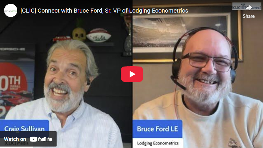 [CLIC] Media is proud to present [CLIC] Live one of our Hospitality, Travel & Tourism interview shows. We are bringing Hospitality Leaders and insights to our conversations from across the Continent and Beyond Joining the conversation today is Bruce Ford of Lodging Econometrics. Please also see Bruce's interviews with Glenn Haussman on No Vacancy News.