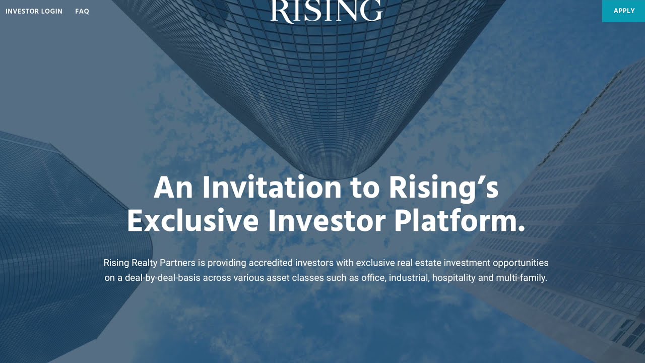 Rising Realty Partners is providing accredited investors with exclusive real estate investment opportunities on a deal-by-deal-basis across various asset classes such as office, industrial, hospitality and multi-family.
